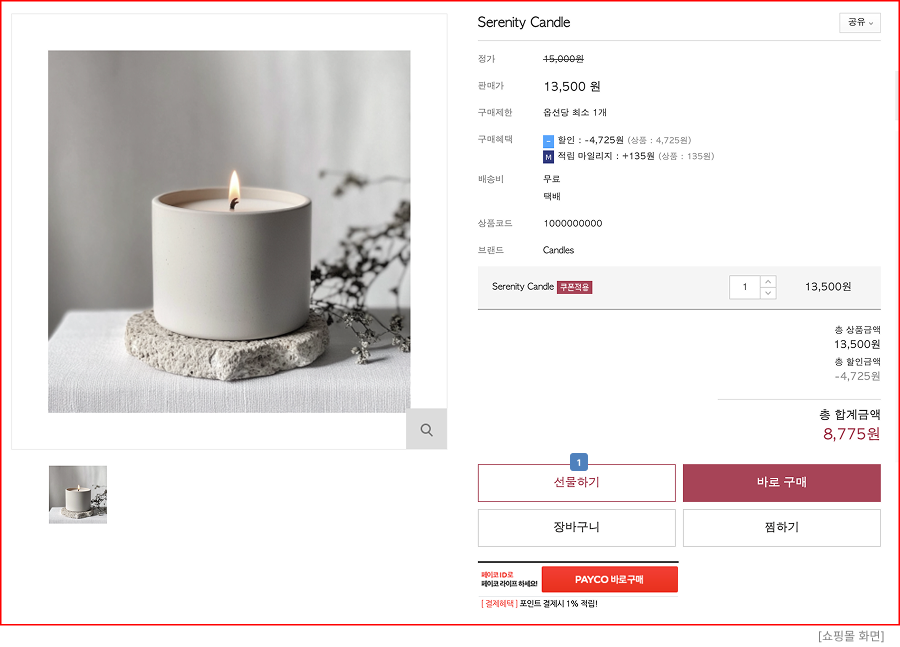 - 선물 상품은 "장바구니/관심상품 설정 화면 > 장바구니 설정 > 바로 구매 설정" 선택 값과 관계없이 선택한 상품과 수량으로만 구매됩니다.