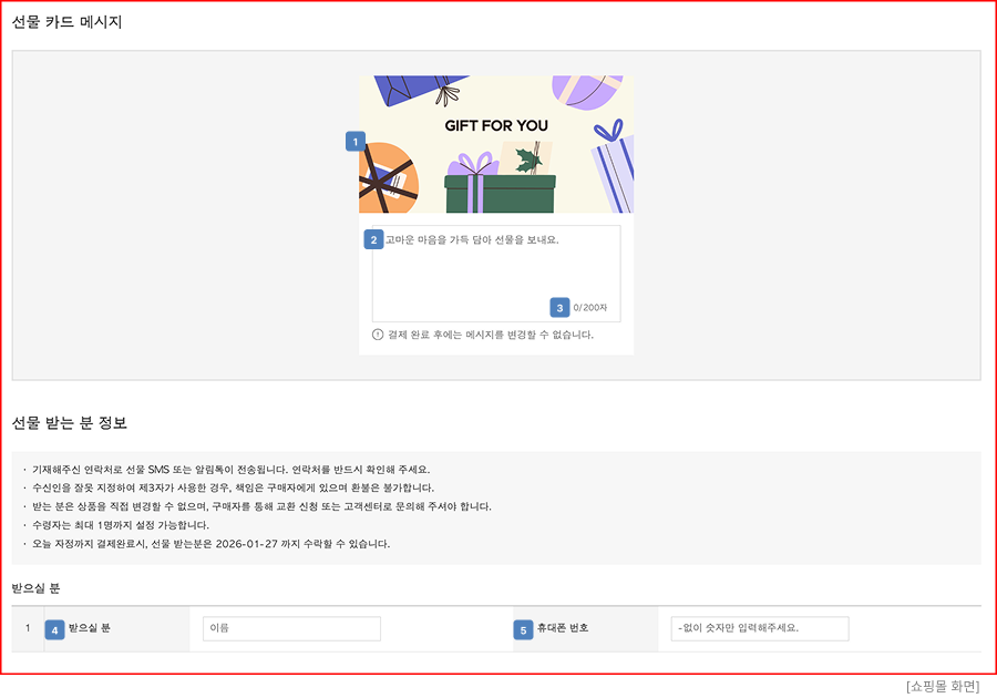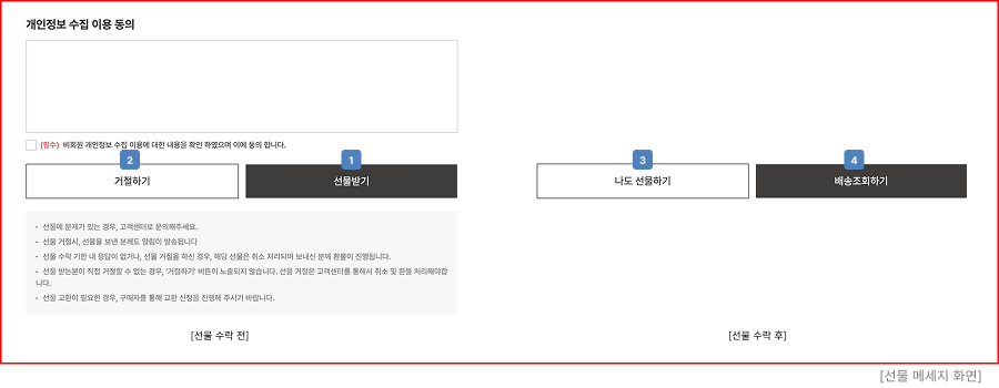 - 선물 메시지 URL은 배송완료, 환불완료, 구매확정시 접근할 수 없습니다.
