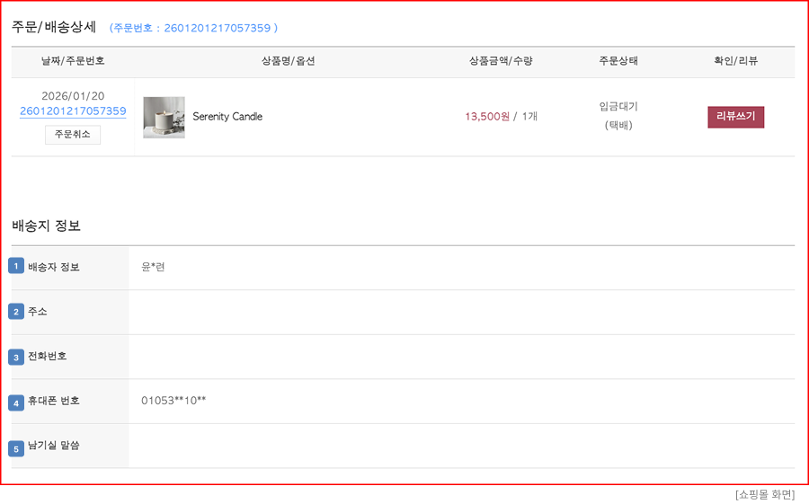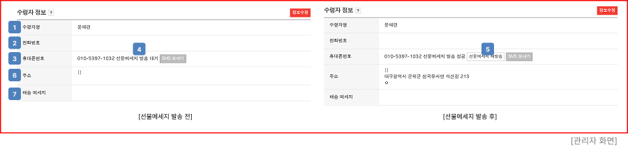 ③ 휴대폰번호 : 최초에는 구매자가 입력한 “받는 분 휴대폰번호”가 출력됩니다.