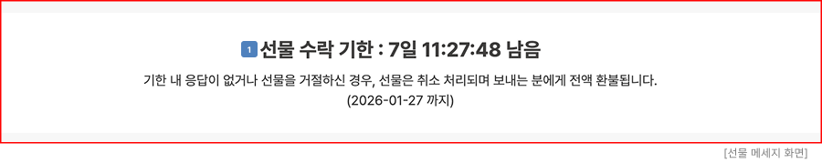 - 선물 메시지를 받은 날로부터 선택된 자동취소일의 23:59:59까지 선물을 수락 또는 거절을 할 수 있도록 설정됩니다.