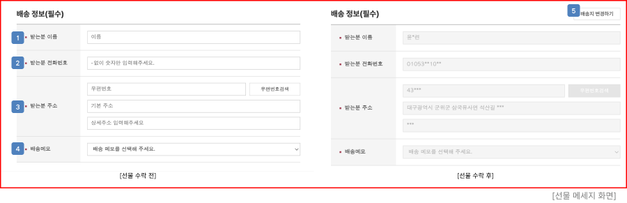 - 받는 분이 배송정보와 개인정보를 입력 및 변경할 수 있습니다.
