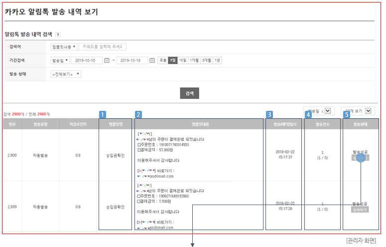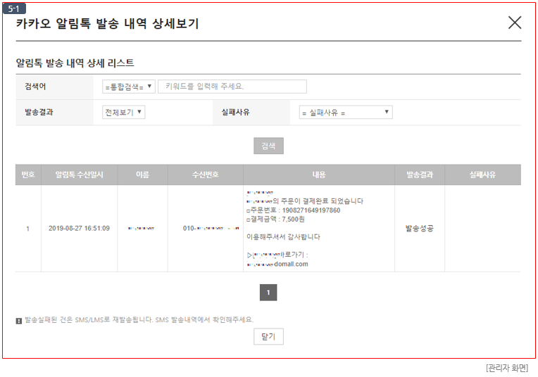 ⑤ 발송상태 : 발송상태를 확인할 수 있으며, [상세보기]버튼 클릭 시 카카오 알림톡 발송 내역 상세보기 팝업이 노출됩니다. (이미지 (5-1) 참고)