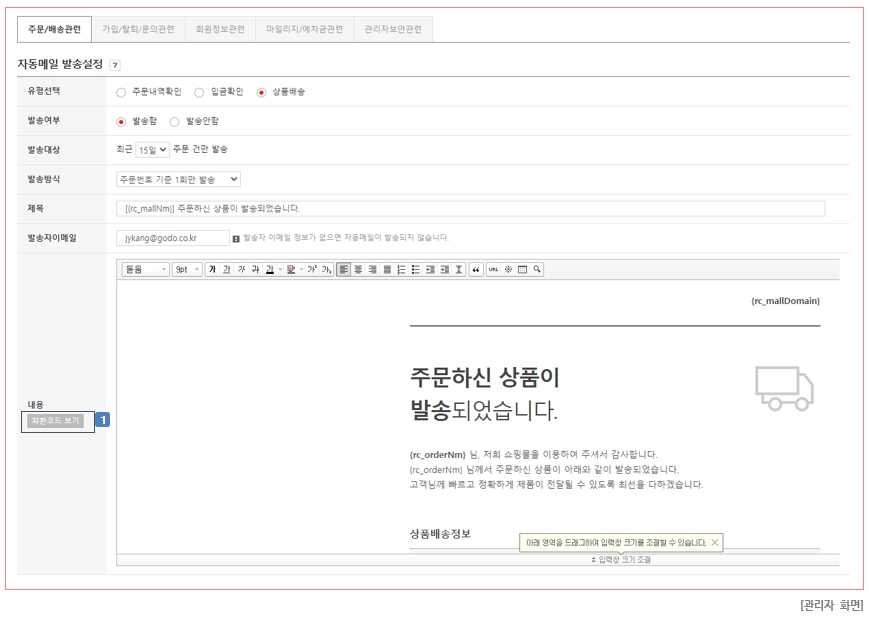 : 상품배송 메일의 내용을 설정합니다.