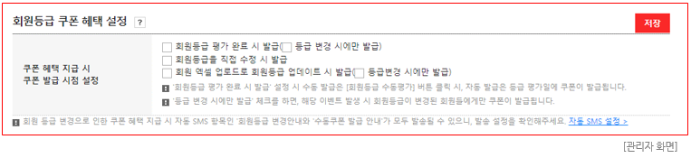 : 체크 후 저장하면, 엑셀 업로드를 통한 회원등급 업데이트 시에도 쿠폰이 발급됩니다.