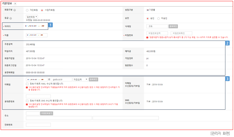 ③ 이메일 / 휴대폰번호 : 수신동의설정 안내메일의 자동발송 설정 여부에 따라 수신동의 변경 시 회원에게 "정보수신동의 변경안내" 자동메일이 발송됩니다.