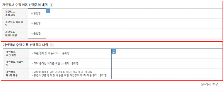 - 회원이 쇼핑몰 회원가입 시 설정한 개인정보 수집 및 이용 선택 동의 여부를 확인할 수 있습니다.