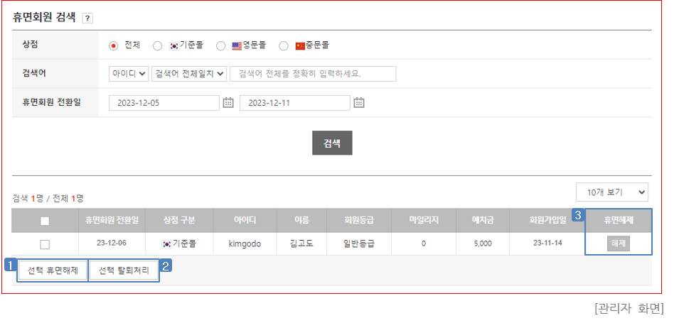 - 쇼핑몰 회원 중 휴면회원으로 전환된 회원 검색이 가능합니다.