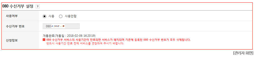 - 080 수신거부 신청 후 080 수신거부 번호가 개통이 완료되면 수신거부 번호와 신청정보가 자동으로 등록됩니다.