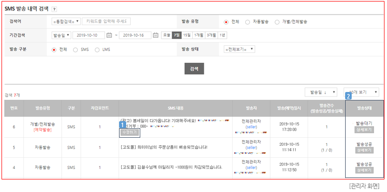 : SMS를 발송한 일자 및 발송 예약일자를 기준으로 검색할 수 있습니다. 기본값은 "발송일", "7일"입니다.