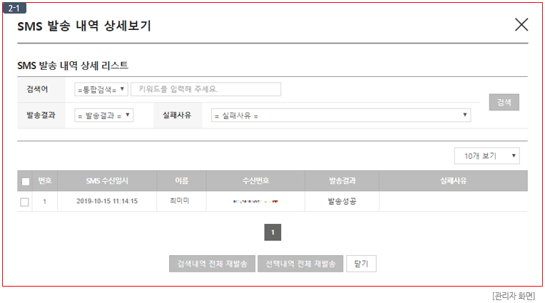 └ [검색내역 전체 재발송], [선택내역 전체 재발송] 기능을 통해 조회된 발송내역의 전체 또는 일부를 재발송할 수 있습니다.
