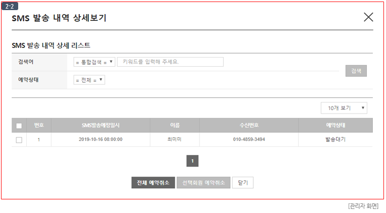 - 발송대기 : [상세보기] 클릭 시 이미지 (2-2)와 같이, 예약된 SMS에 대해 발송취소할 수 있는 화면이 노출됩니다.
