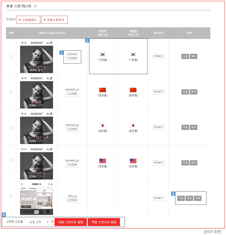 : 현재 보유중인 쇼핑몰 디자인 스킨 리스트를 확인할 수 있으며, 각 스킨의 스킨정보를 확인하거나 및 복사/삭제할 수 있습니다.
