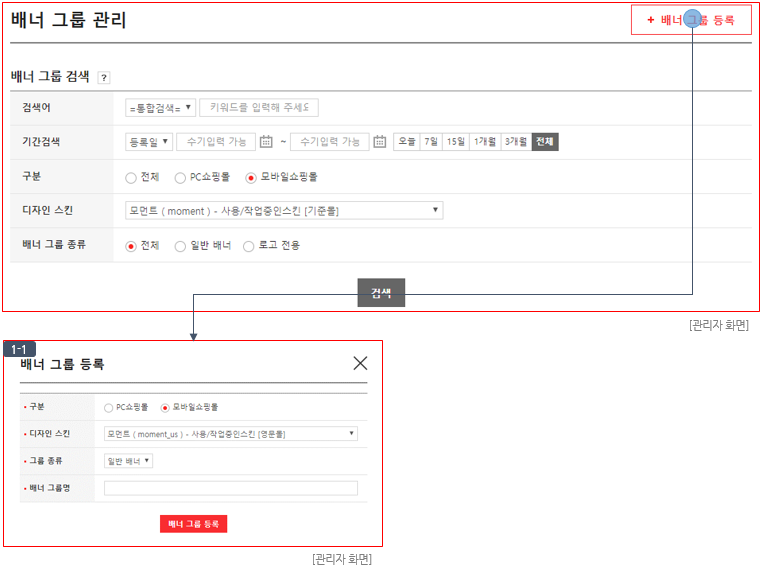 ① [배너 그룹 등록] : 클릭 시 신규 배너 그룹을 생성을 위한 팝업이 출력됩니다. (이미지 (1-1) 참고)