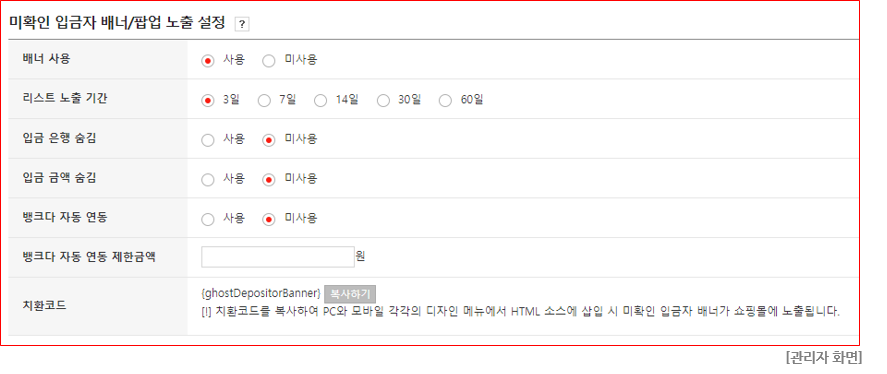 : 쇼핑몰에서 미확인 입금자 배너의 사용 여부를 설정합니다.