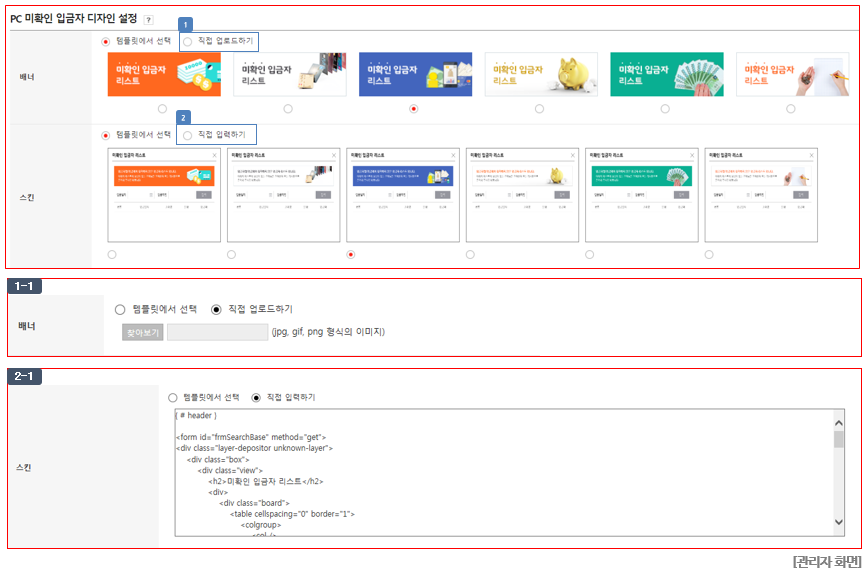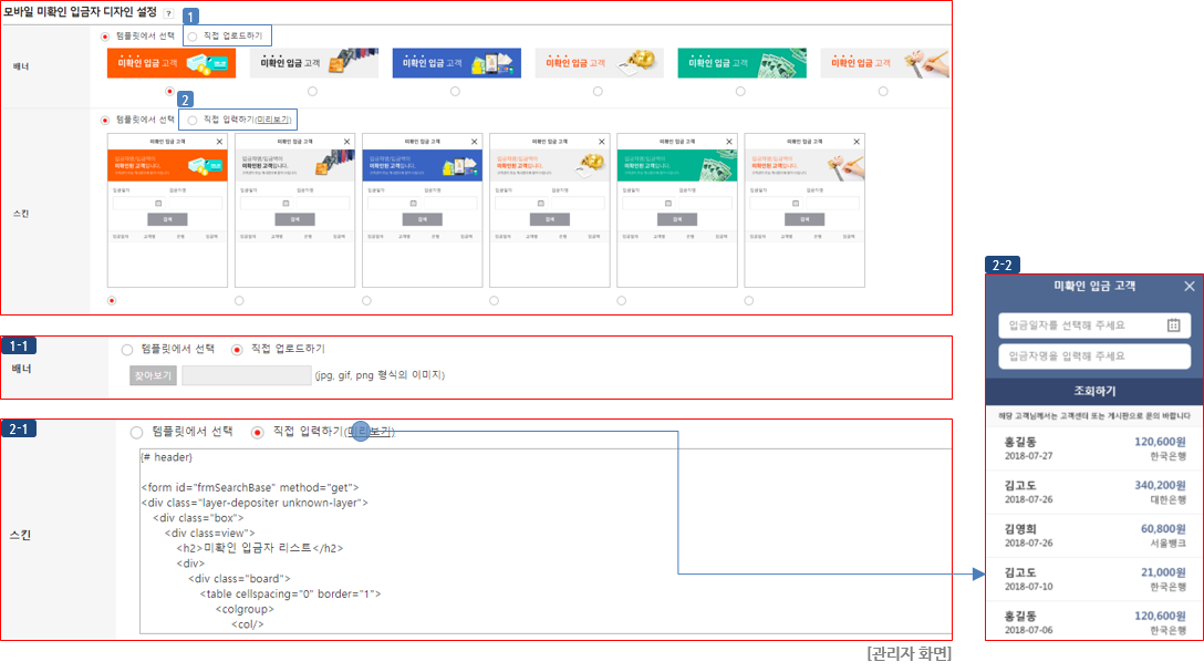 ② "직접 입력하기" 선택 시 미확인 입금자 리스트 스킨을 운영자가 직접 설정할 수 있습니다. (이미지 (2-1) 참고)