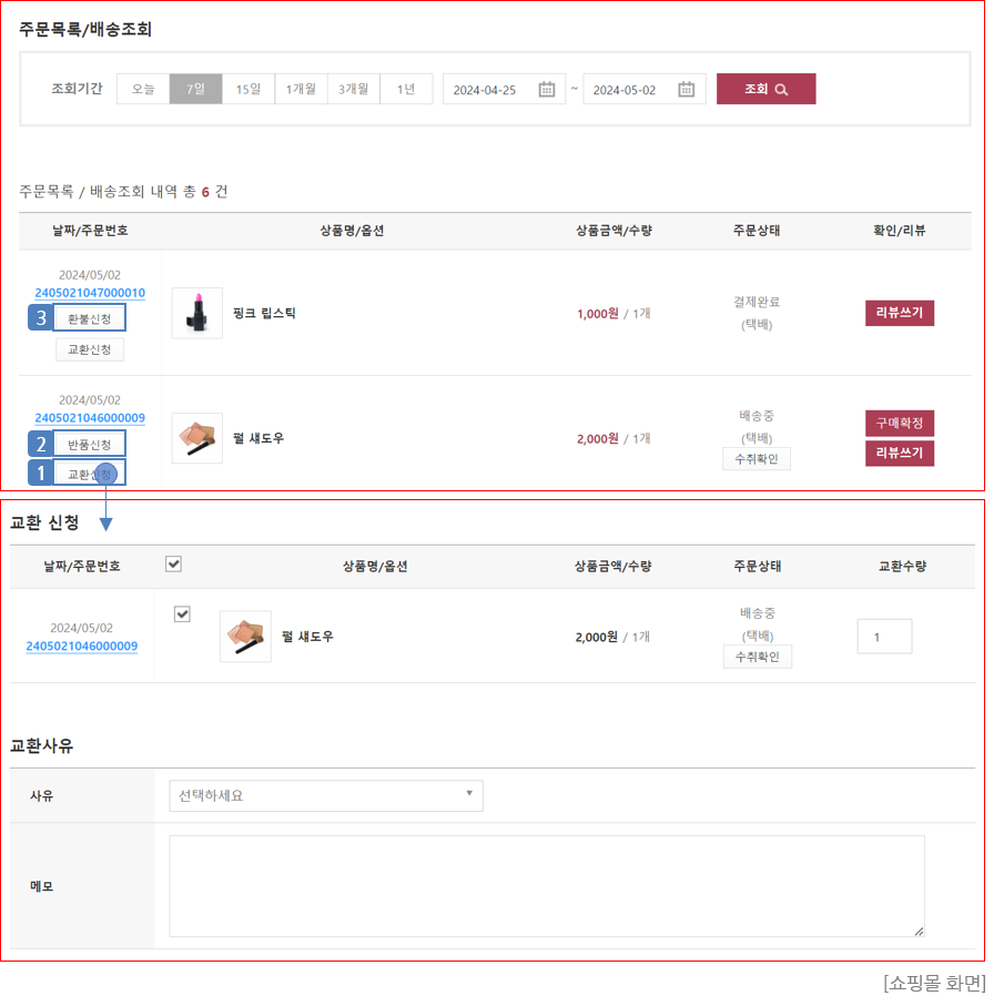 └ 고객 교환신청은 주문건의 주문상태가 "결제완료/상품준비중/배송중/배송완료"일 경우 가능합니다.