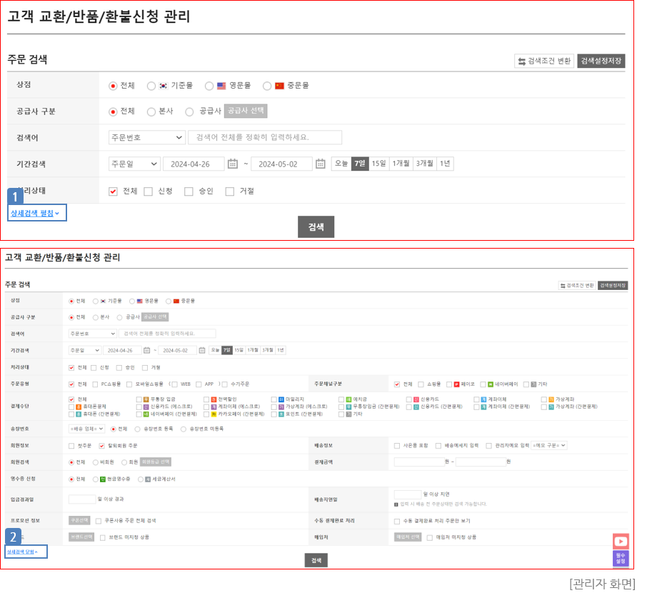 - 고객 교환/반품/환불신청 관리 메뉴 접근 시 "상세검색 닫힘" 상태로 기본 제공됩니다.