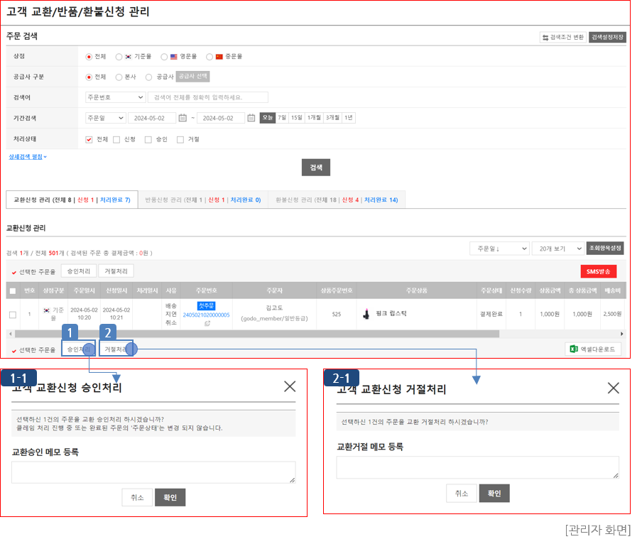 ① 승인처리 : 주문리스트 내 선택된 고객 교환 신청건을 승인 처리할 수 있습니다.