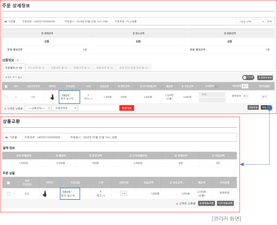 - 구매자가 쇼핑몰 마이페이지에서 교환 신청한 주문 확인 및 승인 또는 거절 처리를 할 수 있습니다.