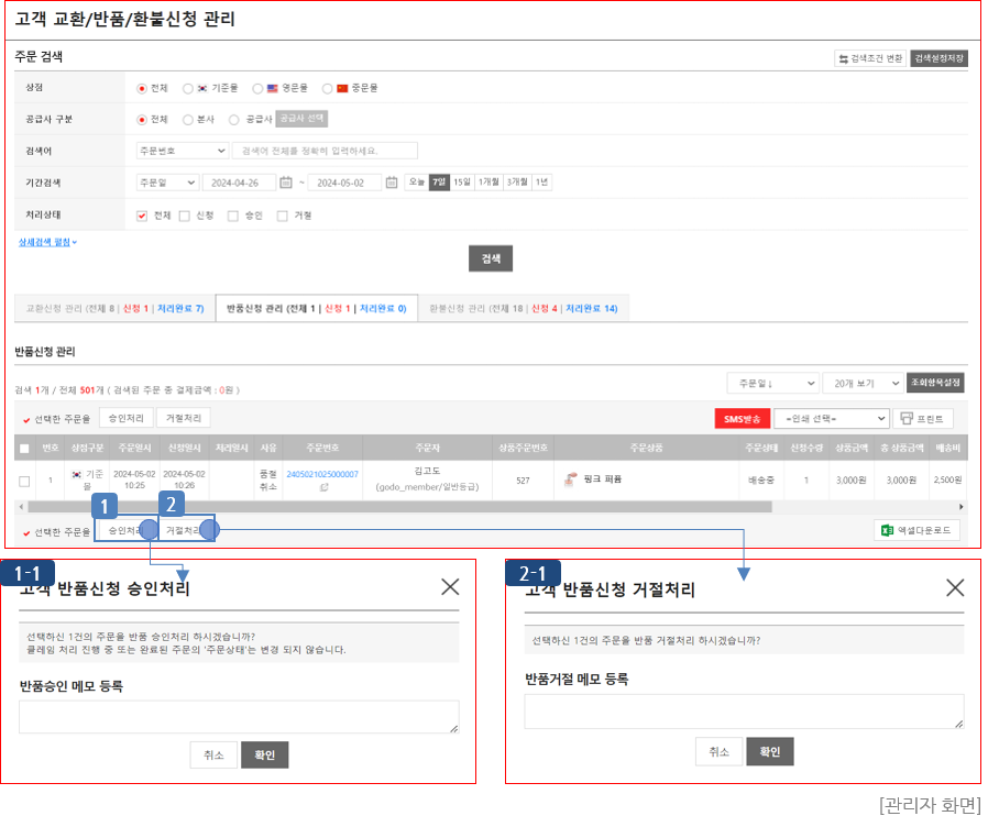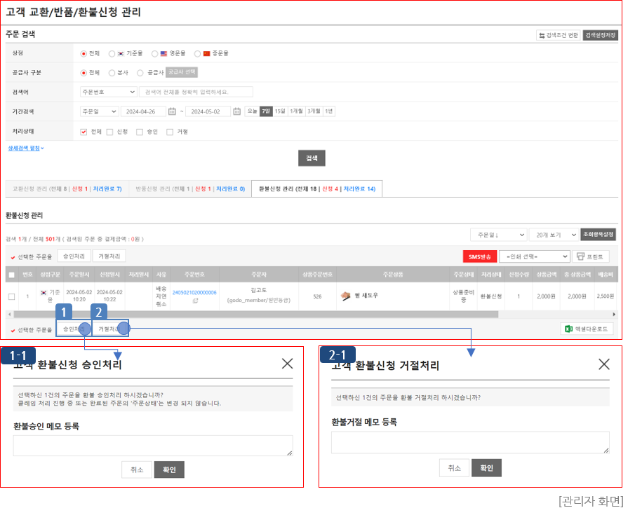 - 고객이 신청한 교환/반품/환불 신청 건에 대해서 관리 및 승인, 거절 처리를 진행할 수 있습니다.
