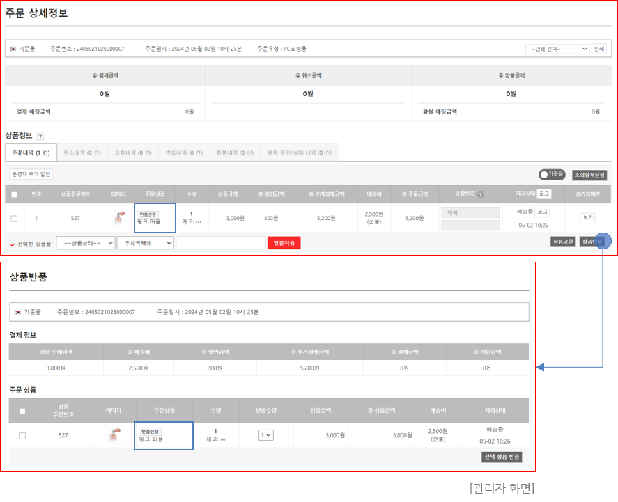 - 구매자가 쇼핑몰 마이페이지에서 반품 신청한 주문 확인 및 승인 또는 거절 처리를 할 수 있습니다.