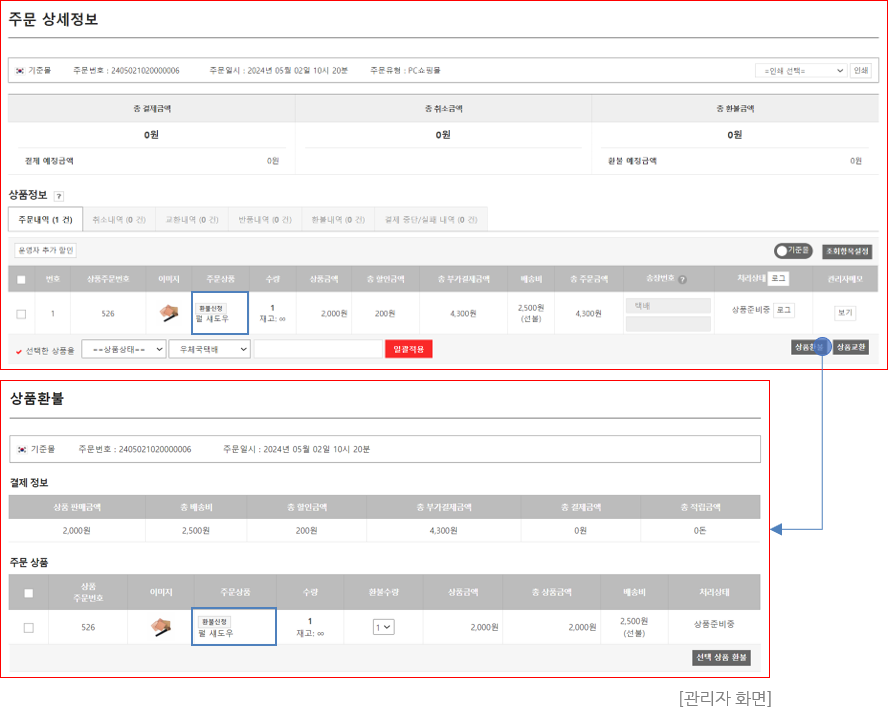 - 구매자가 쇼핑몰 마이페이지에서 환불 신청한 주문 확인 및 승인 또는 거절 처리를 할 수 있습니다.