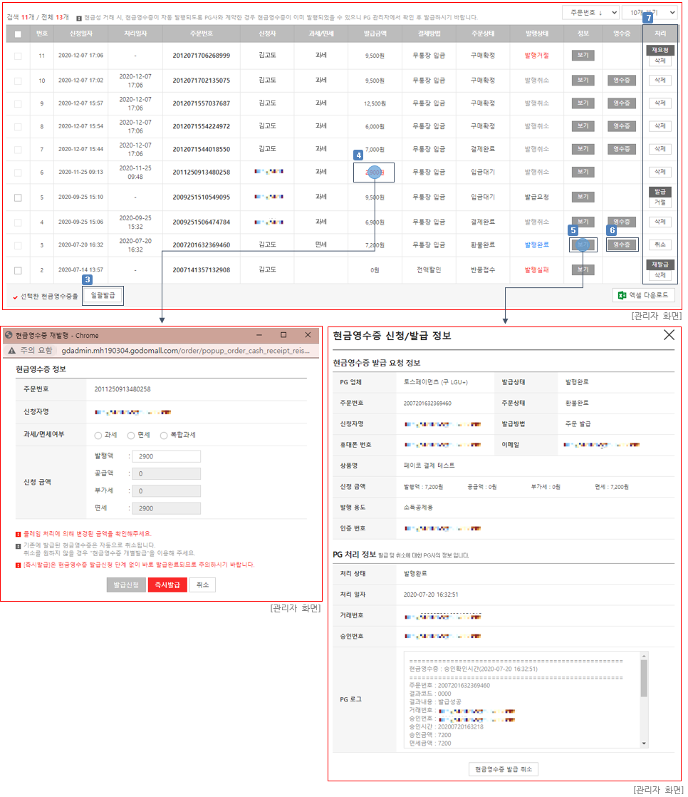 발행용도 / 인증번호" 정보 및 PG 처리 정보 "처리 상태/처리 일자/거래번호/승인번호/취소승인번호/PG로그"내용을 확인할 수 있습니다.