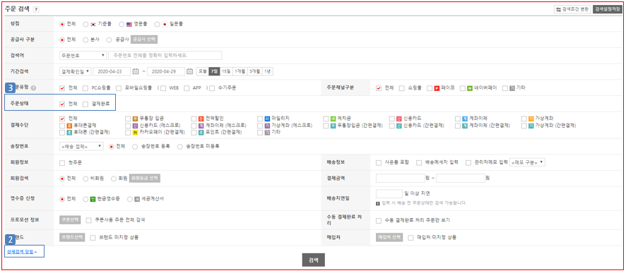 - 결제완료 리스트 메뉴 접근 시 "상세검색 닫힘" 상태로 기본 제공됩니다.