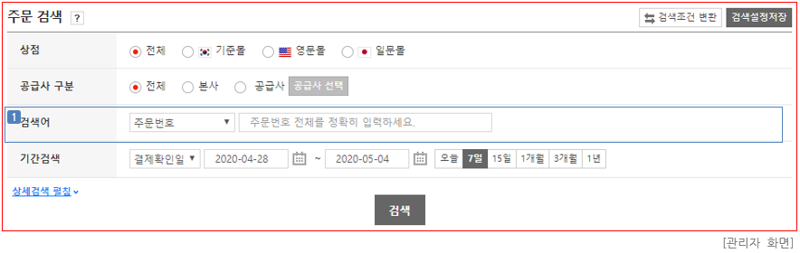 ③ 기간검색 설정 항목 : 다중 조건검색인 경우 최대 6개월 이내의 주문 데이터만 검색 가능합니다.