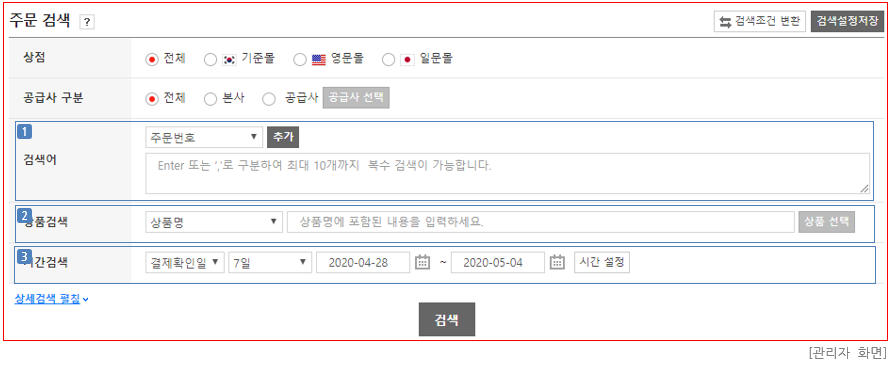 - 수기주문 : 고객이 쇼핑몰에서 직접 결제한 주문이 아닌, 운영자가 관리자 화면에서 수기로 등록한 주문만 검색합니다.
