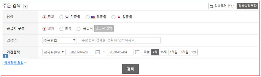 - 우측 상단의 '검색조건 변환' 버튼을 클릭 하여, '단일 검 색조건'과 '다중 검색 조건' 중 선택할 수 있으며 검색 조건은 주문/배송 메뉴 전체에 적용됩니다.