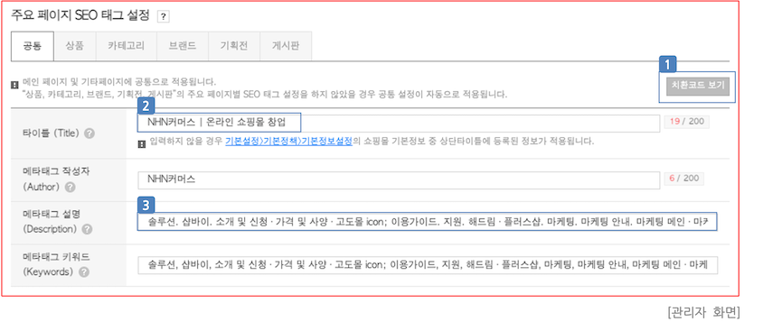 - 메타태그 작성자는 검색 시에 노출되지 않지만 검색엔진에서 쇼핑몰을 색인하는 용도로 활용됩니다.