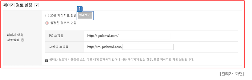 - 고객이 존재하지 않는 쇼핑몰 페이지로 접근 시 어떤 경로로 연결할 것인지를 설정할 수 있습니다.