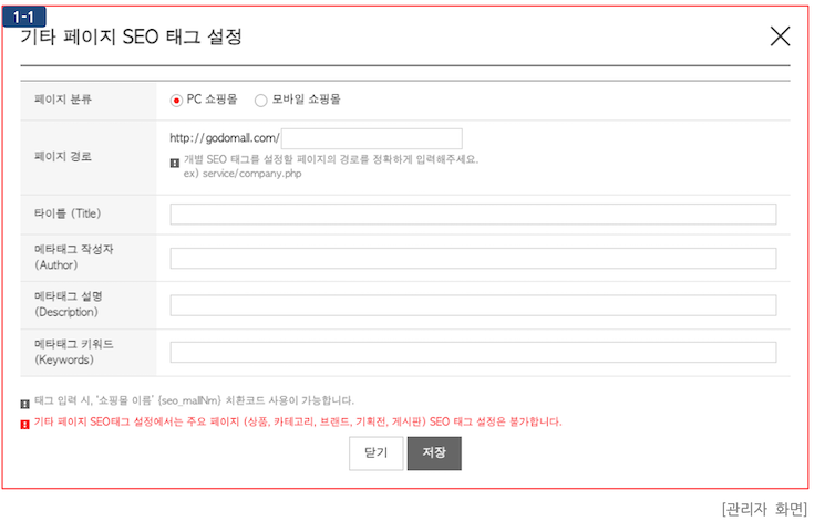 - 페이지 분류 : 설정하고자 하는 페이지의 분류를 'PC 쇼핑몰'과 '모바일 쇼핑몰' 중 선택합니다.