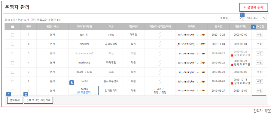 ① 선택삭제 : 운영자 정보를 선택하여 [선택삭제]를 클릭하면 삭제할 수 있습니다. (최고운영자 및 대표운영자 계정은 삭제할 수 없습니다.)