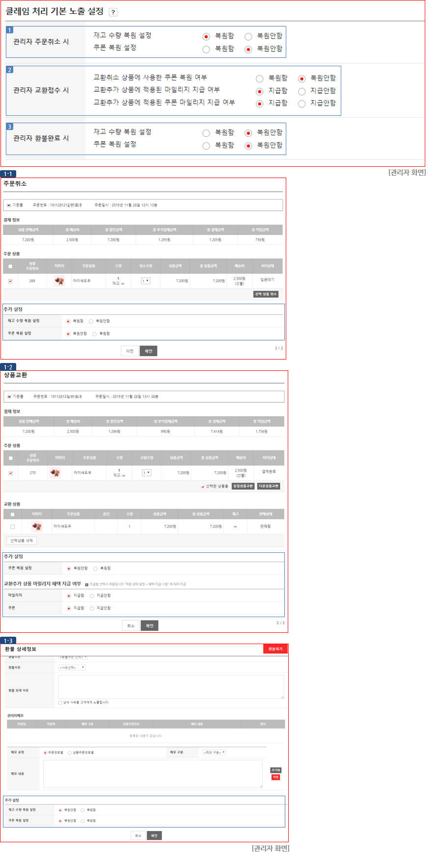 ③ 관리자 환불완료 시 : "주문/배송 > 취소/교환/반품/환불 관리 > 환불 상세정보" 팝업 내 추가 설정 항목의 기본 선택값으로 적용됩니다. (이미지 (1-3)참고)