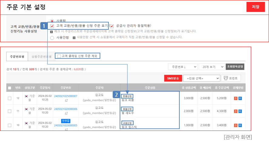 ① 고객 교환/반품/환불 신청 주문표기 체크 후 주문 기본 설정 저장 시, 고객이 교환/반품/환불을 신청한 주문 건에 아이콘이 표기되어 빠르게 확인할 수 있습니다.
