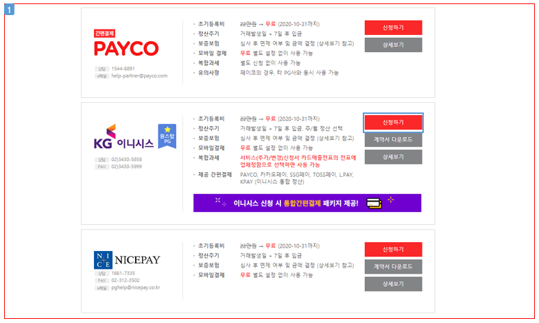 ① 신청 1단계 : 관리자 "부가서비스 > 결제 > 전자결제(PG)" 또는 NHN커머스 홈페이지의 "솔루션 > 운영 > 부가서비스 > 결제/간편결제 > 전자결제(PG서비스)" 화면에서 이용할 PG사를 선택하여 [신청하기]를 누릅니다. ([계약서 다운로드]를 눌러 해당 PG사의 계약서도 다운로드합니다.)