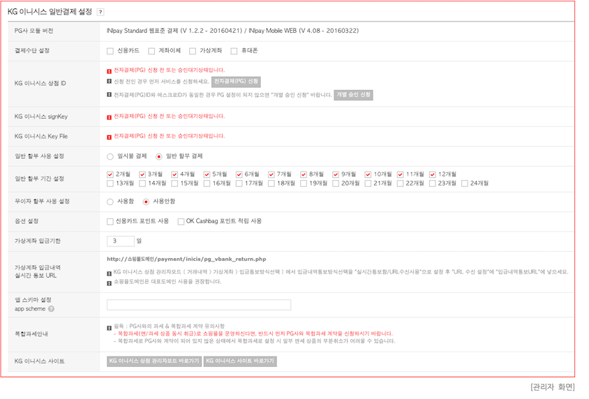 : [KG 이니시스 상점 관리자 모드 바로가기] 클릭 시 KG 이니시스에서 제공하는 상점관리자 화면으로 바로 이동할 수 있습니다.