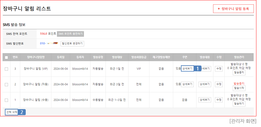 : 장바구니 알림은 SMS 잔여 포인트가 있어야 발송됩니다.