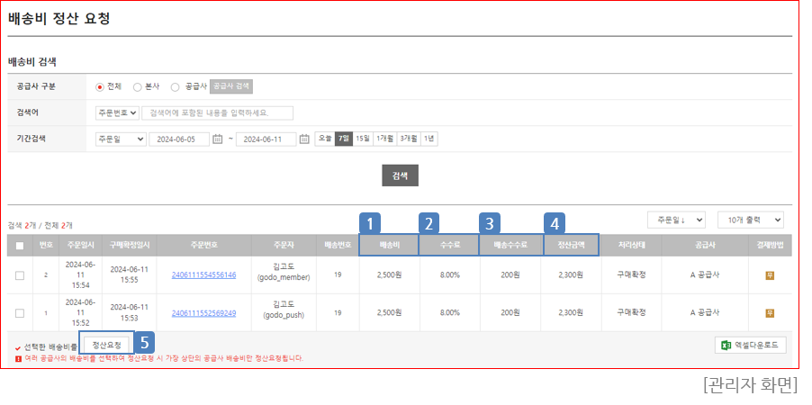 ⑤ 정산요청 : 선택된 배송비를 정산 요청하여 당월 정산 내역에 추가합니다.