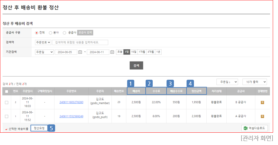 - 정산 이후 발생한 환불 건의 배송비에 대해 정산 처리합니다.