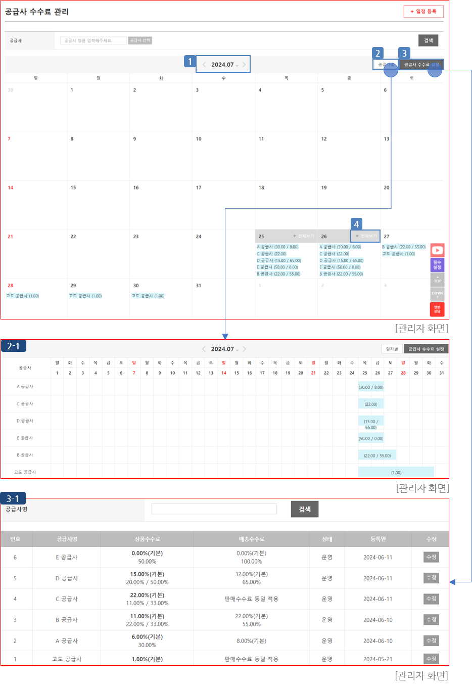 ② 공급사별 : 버튼 클릭 시, 일자 별이 아닌 [2-1] 이미지 처럼 공급사 별로 수수료 일정을 확인할 수 있는 화면으로 전환됩니다.