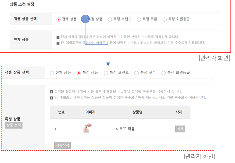 - 전체 상품 : 쇼핑몰에 노출/판매되고 있는 전체 상품에 기본 정보 영역에서 지정된 기간동안 선택한 수수료를 적용합니다.