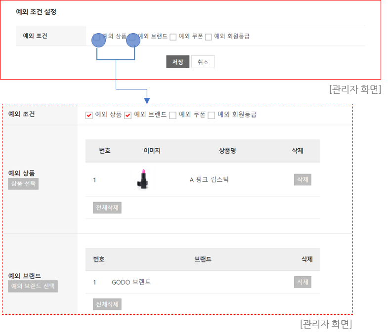 └ [상품 선택] 클릭 후 상품 선택 시 "예외 상품" 항목에 선택된 상품 정보가 노출됩니다.