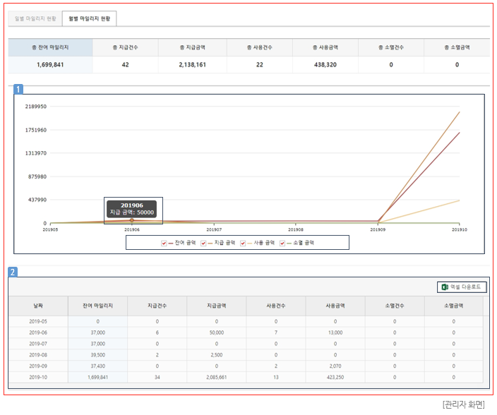 - 월별 마일리지 현황 : 설정한 기간동안의 회원 마일리지 현황을 월별로 확인할 수 있는 통계 화면입니다.
