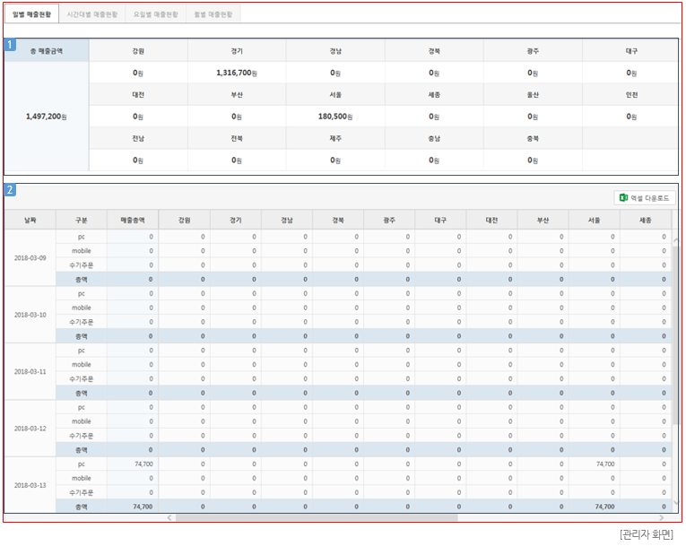 - PC쇼핑몰, 모바일 쇼핑몰, 수기주문 및 정기주문을 구분하여 구매자 지역을 기준으로 쇼핑몰의 매출현황을 확인할 수 있습니다.